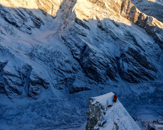 After the fresh snow the descent was slow and worrying. We thread a line between seracs and avalanche prone slopes, abseiling most of the way. Before downclimbing a long rock ridge that led us safely down to the valley below. The descent took a further two days.