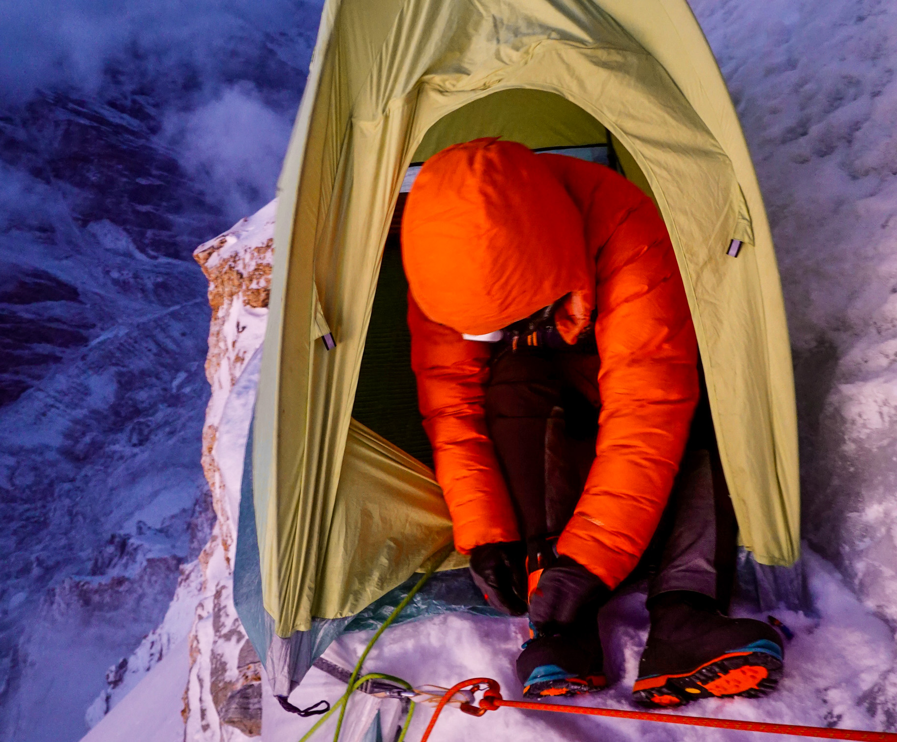 Sadly, after many days of good weather the summit was reached in a whiteout so we had to bivouac for another night hoping for improved visibility on the descent, which we could see was going to be longer and more complex than expected. That night it snowed heavily.