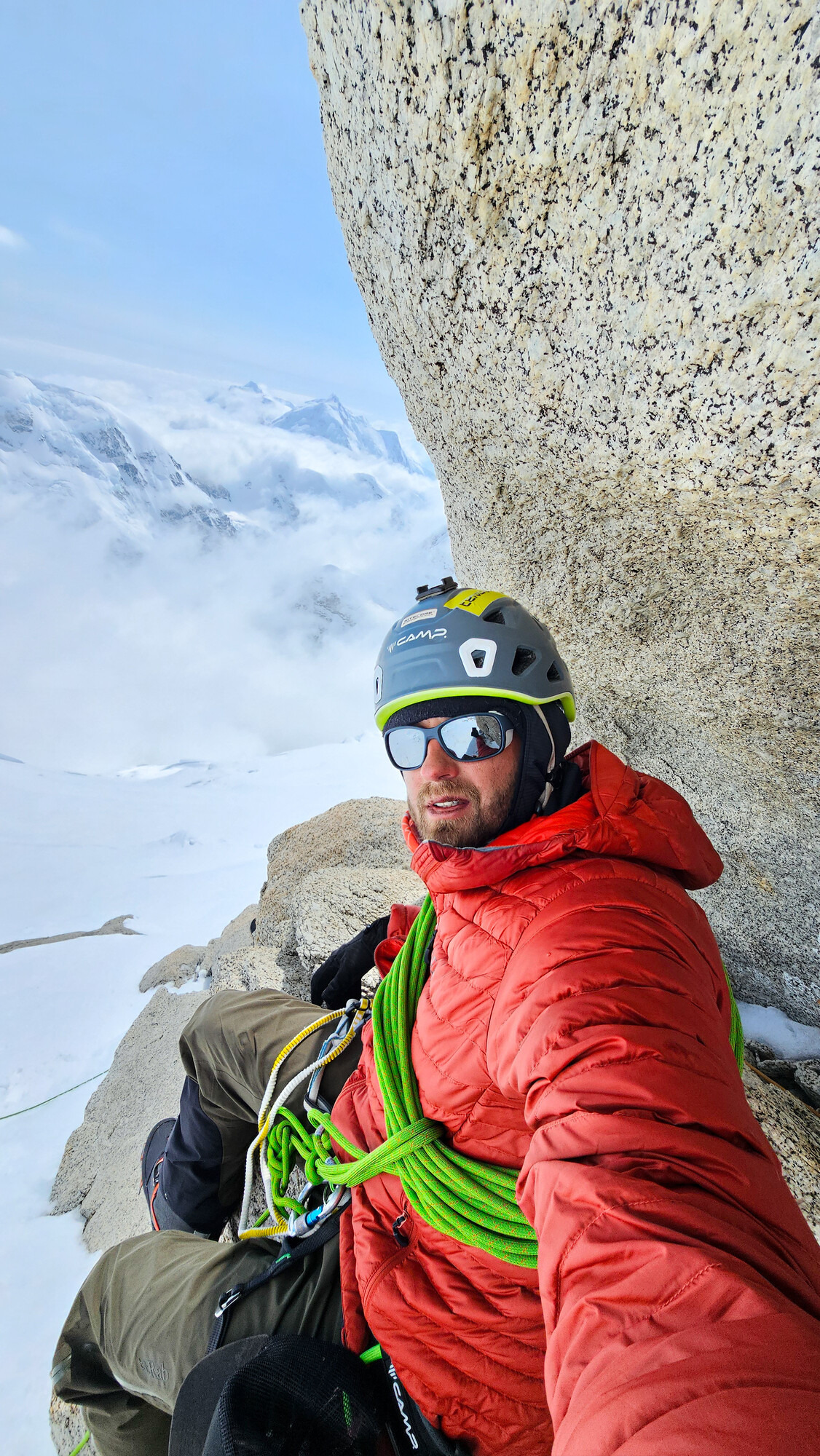 A mix of vertical ice, deep snow, clean rock, and a ridge as sharp as a razor. We experience everything from relatively comfortable bivouacs to those where we huddle on narrow ledges that we had to carve out of extremely hard ice. In the end, we are slowed down by a storm that traps us at around 5,200 meters. The Japanese couloir is something like an alpine north face. A long, narrow gully that opens into a ridge. I didn't even count the length, but we spent the whole day in it. This was followed by the most difficult rock passage – a chimney that opened into the dreaded Cowboy Arete. An ice ridge as sharp as a razor. Hard blue ice with snow that doesn't stick to it. We secured some parts, elsewhere the protection was just for peace of mind. Behind it, however, was a nice place to bivouac, and above it an overhanging glacier and the first rock barrier (Rock band). A green rope between us, an orange one hidden in our backpacks in case of emergency. We started climbing with one, and so we continue. Above the first rock barrier is the second. Both combine mixed climbing through various gullies, slabs, and blocks interwoven between them. Then "just climb to the top." It was during this final climb, with 1,200 meters of climbing still ahead of us, that a storm caught us. An emergency bivouac, in which we are crammed like sardines in a can. Frozen into ice cubes, as snow constantly covers us from all sides, even though we are sheltered under a rock overhang. I am happy for the new ropes. Mine would be as hard as concrete by now. It's clear that these conditions are perfect for them. Only we are suffering. The next day, the weather allows us to climb only 300 meters on steep slopes, where deep unstable snow alternates with firn and ice slabs. The rope is just a placebo. Hopefully, we'll reach the summit the next day. We are out of food.
