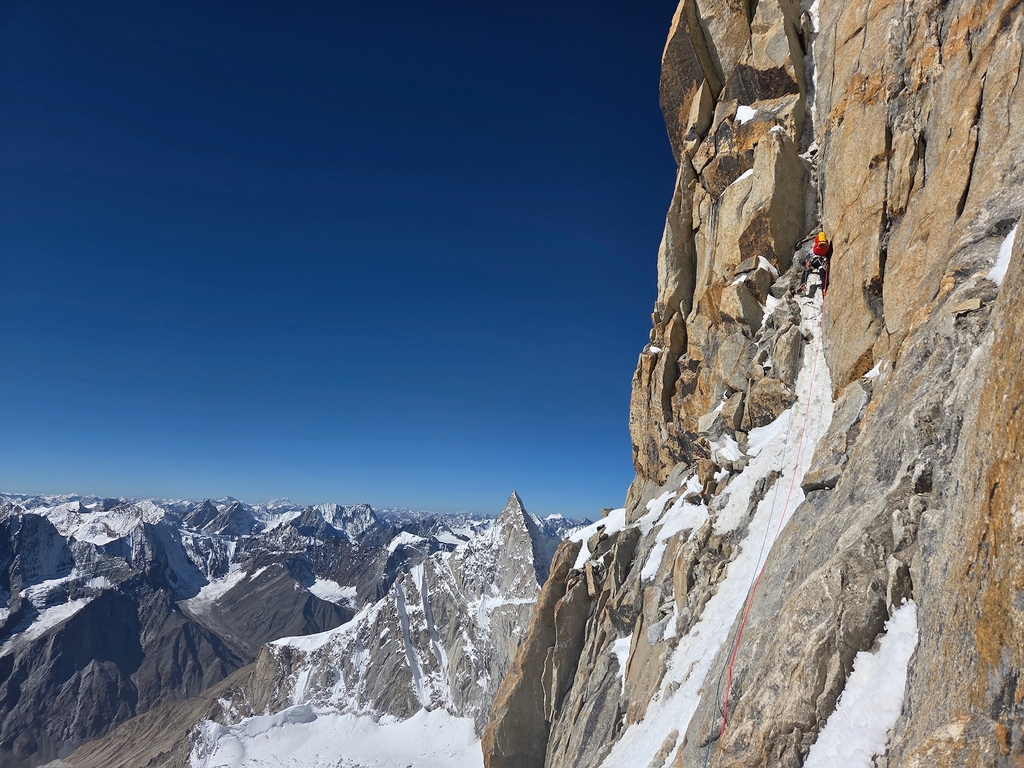 The next morning we waited for the sun to hit the bivy around 7 a.m. — a welcomed morale boost. I led the first few pitches; everything went smoothly, though evry pitch demanded tons of effort. We were now around 6250 m, and for both Michał and me it was our first time climbing technically at that altitude. Everything moves slower than in the Alps. The mind wants to push harder but the body protests — things have a different pace up here.