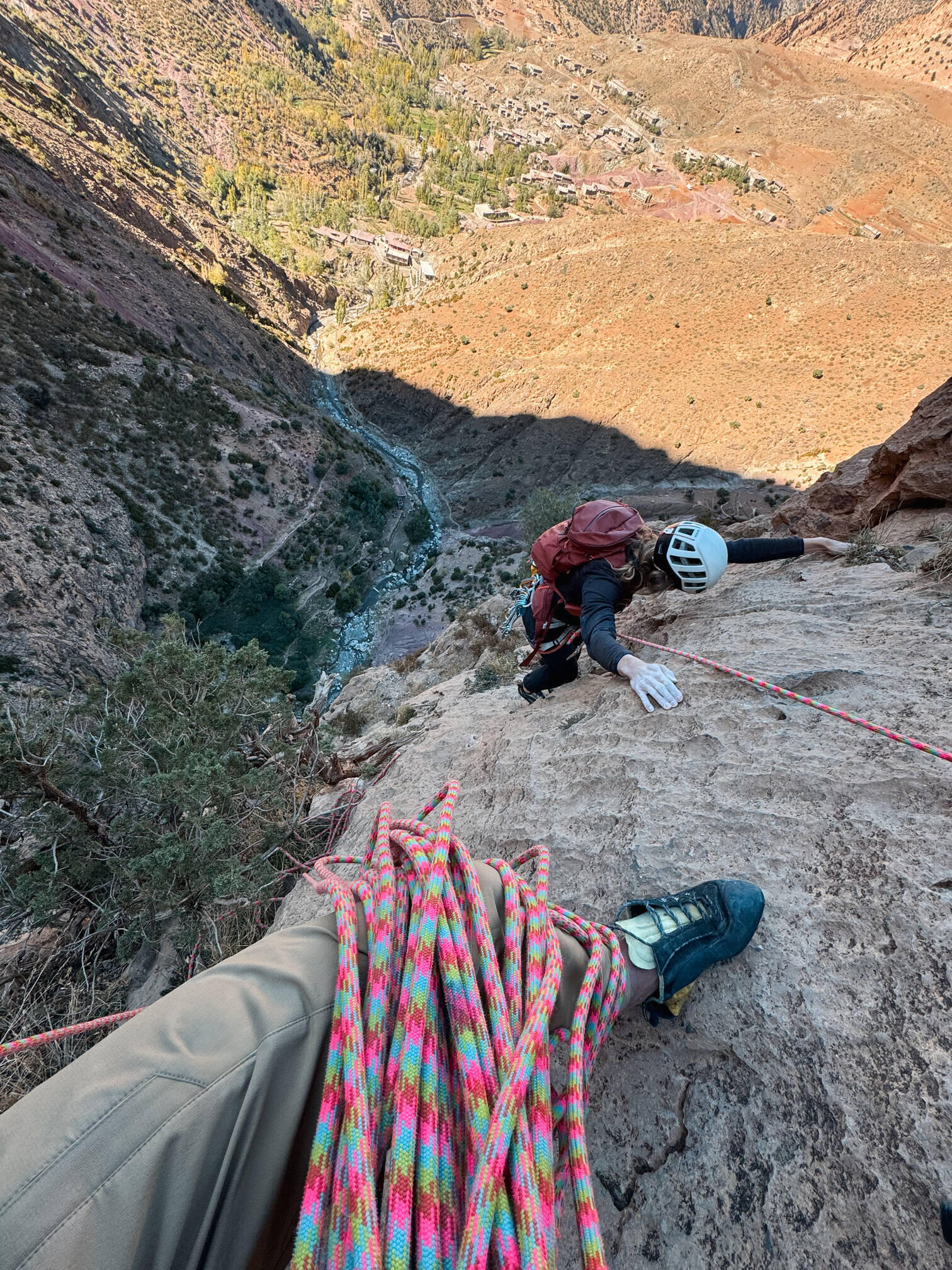 Bydlí se u místních, kteří už jsou na lezce za ty roky zvyklí a vlastní domy častokrát rozšířili o ubytovací prostory. Dá se říct, že vesnice už je napůl živá z lezeckého turismu a rychle se díky tomu rozrůstá. Velký boom lezců nastal v posledních 5 letech. My jsme tu potkávali dalších několik desítek lezců z celé Evropy a když už Taghia nemá tu samou atmosféru nově objevené lezecké oázy jako před 20-30 lety, tak je to přenádherné místo s pohodovou atmosférou, svět sám pro sebe. S Alicí jsme tu vylezli několik nejklasičtějších stěn jako Paroi de Source, Taoujdad, Oujdad, Paroi de Cascade,… ale je tu toho tolik a tak krásného, že se budeme muset vrátit a na delší dobu. Já už mám v hlavě list těžších cest, do kterých se příště chci podívat, jelikož s Alice jsme tenhle výlet lezli jen lehčí klasiky a na větší věci jsem tu parťáka neměl. Po 9 dnech jezení stále stejného tažínu jsme si řekli, že se vydáme někam dál po Maroku za surfováním.