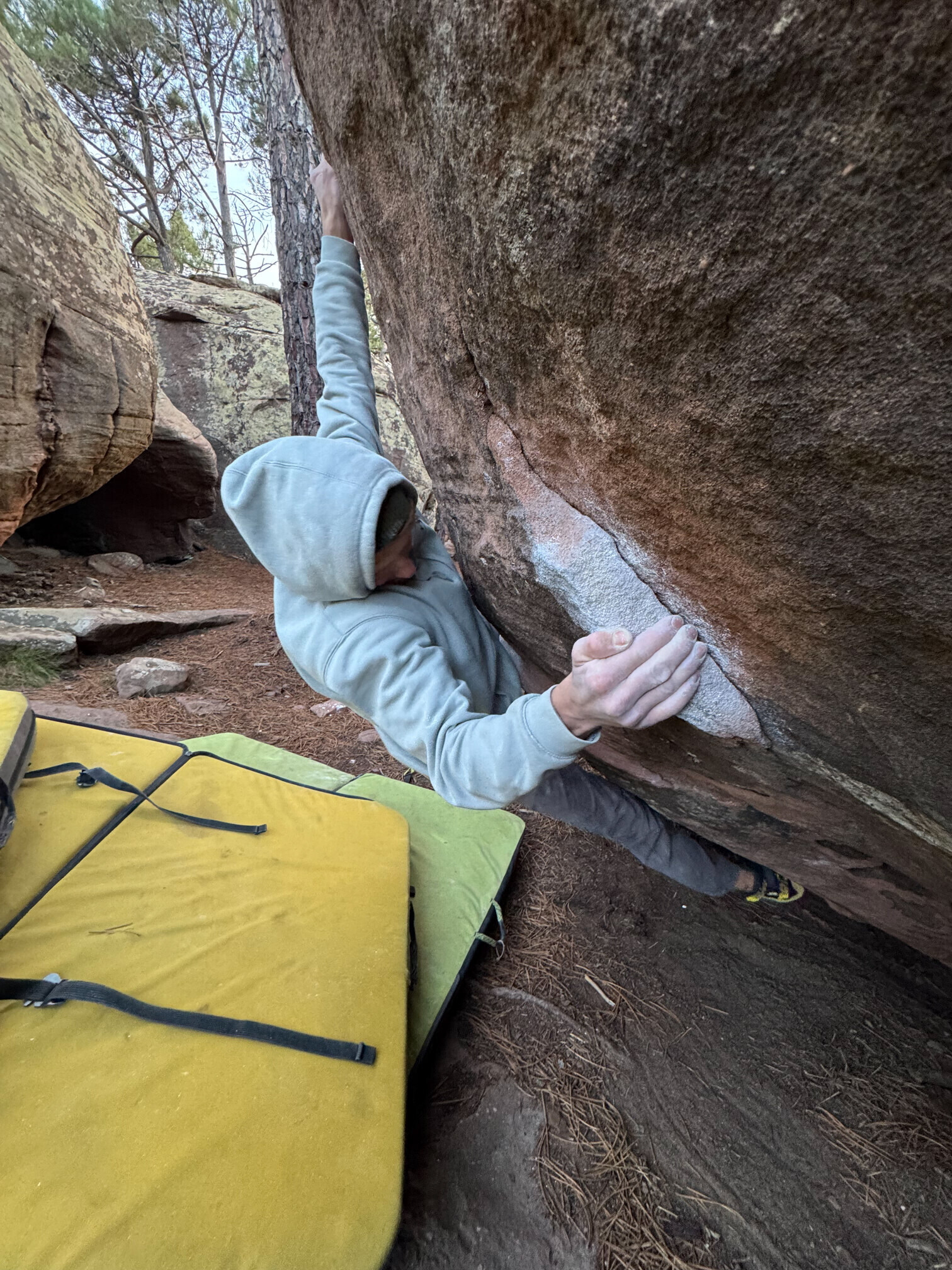Zbýval nám týden tripu a já hned věděl, kde ho chci strávit bez dalšího přejíždění, v Albarracínu!  Mezi bouldristy velmi známa bouldrová oblast. Borovicové lesy, oranžový písek, lezení všech úrovní a pohoda. Já jsem příšerný bouldrista a na bouldering jsem bohužel vždycky trochu plival, ale teď mě baví čím dál víc. S přibývajícími ambicemi ve skalním lezení to zároveň beru jako perfektní trénink na lezení na lano. Byla to další zastávka v jiné krajině, jiném sportu, jiném vesmíru. Během týdne jsme si krásně rozedrali kůži na prstech, pováleli se na matracích a vylezli pár dvoumetrových šutrů. Super! Doporučuju všem alpinistům. A tak jsme mohli v klidu odjet zpátky domů.